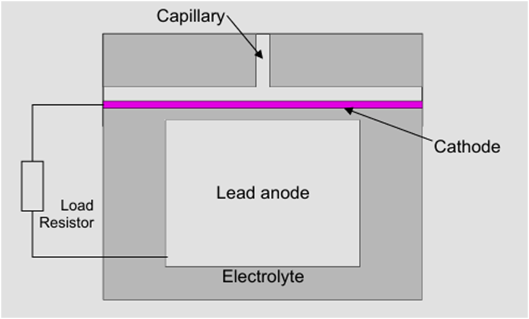電化學氧氣傳感器通過電化學反應將氧氣濃度轉化為電信號進行量化。具體來說,當混合氣體中的氧氣分子穿過傳感器一側的半透膜進入電解液內部時,氧氣在陰極被還原為氫氧根離子(OH?),同時產生電子。這些電子通過外部電路回流至陽極,形成閉合回路。還原與氧化反應產生的電流與進入電解液的氧氣濃度直接相關,即氧氣濃度越高,產生的電流越大。通過精確測量并轉換此電流,即可確定混合氣體中氧氣的濃度。